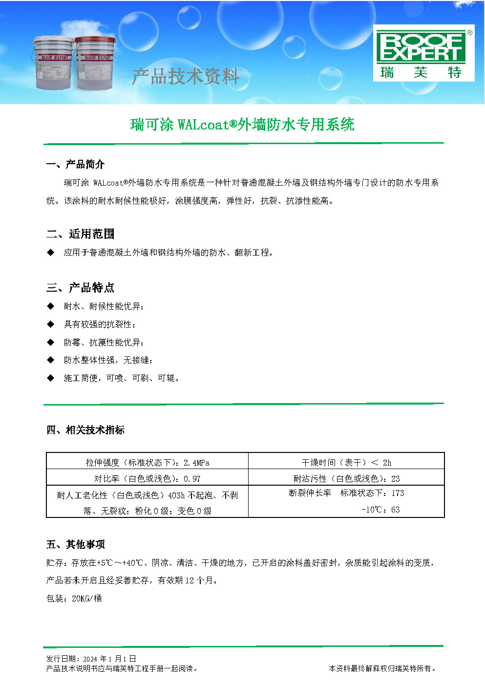 瑞可涂WALcoat®外墙防水专用系统是一种针对普通混凝土外墙及钢结构外墙专门设计的防水专用系统。该涂料的耐水耐候性能极好,涂膜强度高,弹性好,抗裂、抗渗性能高。